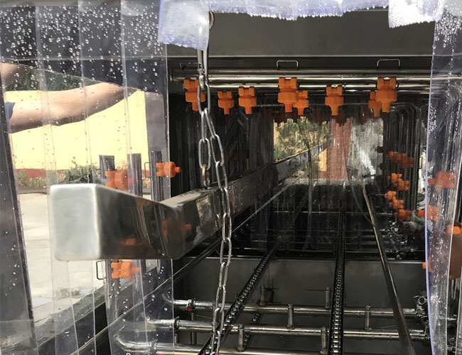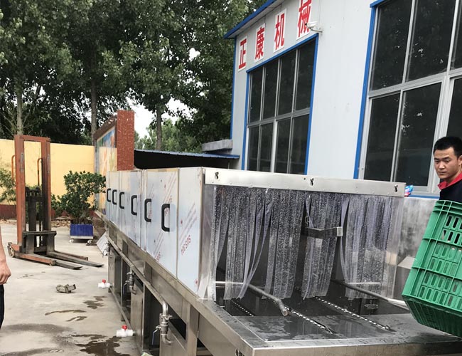 正康全自動周轉(zhuǎn)筐清洗機適用于各種塑料筐,雞蛋筐,清潔筐,主要清洗原理是通過軌道載動框子往前行走,走過三個清潔走廊,周轉(zhuǎn)筐清洗機第1步是用溫水跟洗劑液或者堿水對箱子進行高溫高壓噴射清洗,能有效去除污漬油渣油漬,第二部是熱堿水清洗,第三部為清水沖洗,可根據(jù)客戶每天的清洗量來定制洗筐機的長度,每個水龍頭都有特殊工藝制造,不易損壞,四面噴水,耐高溫材質(zhì),清洗水箱分為兩組,沒組都帶有過濾裝置,清洗室兩側(cè)的門都可以打開,方便清潔維修保養(yǎng),進出口用軟門簾封閉防水,人性化設計。正康周轉(zhuǎn)筐清洗機設備特點,速度溫度可調(diào)節(jié),操作自動化。雙層過濾網(wǎng),可隨時清理,可調(diào)節(jié)毛刷,清洗更干凈,管路減震鏈接,不摩擦下面軌道,運行更穩(wěn)定。毛刷刷洗段,消毒水噴淋段以及烘干段可根據(jù)客戶要求定制。