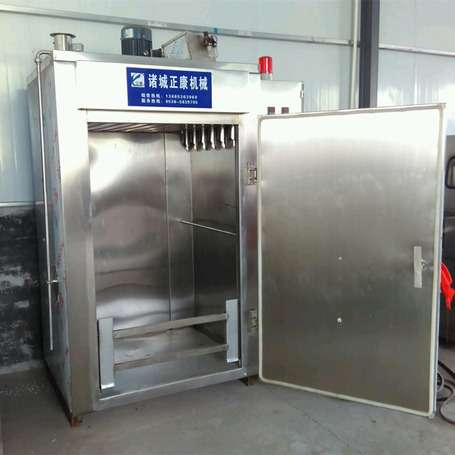 本設(shè)備由煙熏箱、自動程序控制器、煙霧發(fā)生器、煙熏車四部分組成。關(guān)鍵部件是由蒸汽管道、熱交換器和出氣通道組成完善的循環(huán)系統(tǒng),箱內(nèi)熏煙與熱氣的混合氣體在兩組循環(huán)風(fēng)機(jī)的作用下,形成渦流區(qū)域,使混合氣體以適宜的速度平衡而均勻地通過懸掛在煙熏箱內(nèi)的肉制品,使其熟化和滅菌。