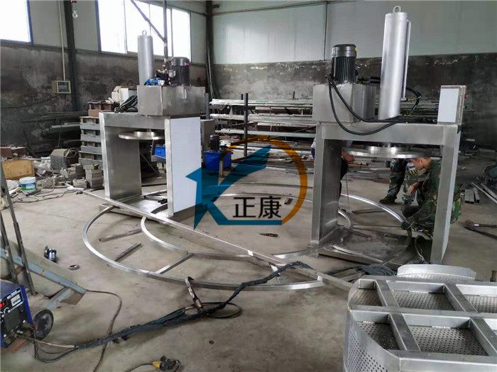 海菜脫水,由于特殊的加工工藝,只能在一端裝料,另一端出料。經雙方研究商討,后確定方案,用了兩臺壓榨機,然后用環(huán)形的軌道將之連接,以實現(xiàn)進料出料不同端的工藝要求。