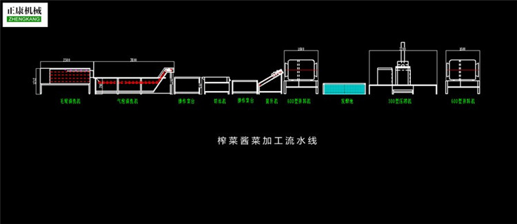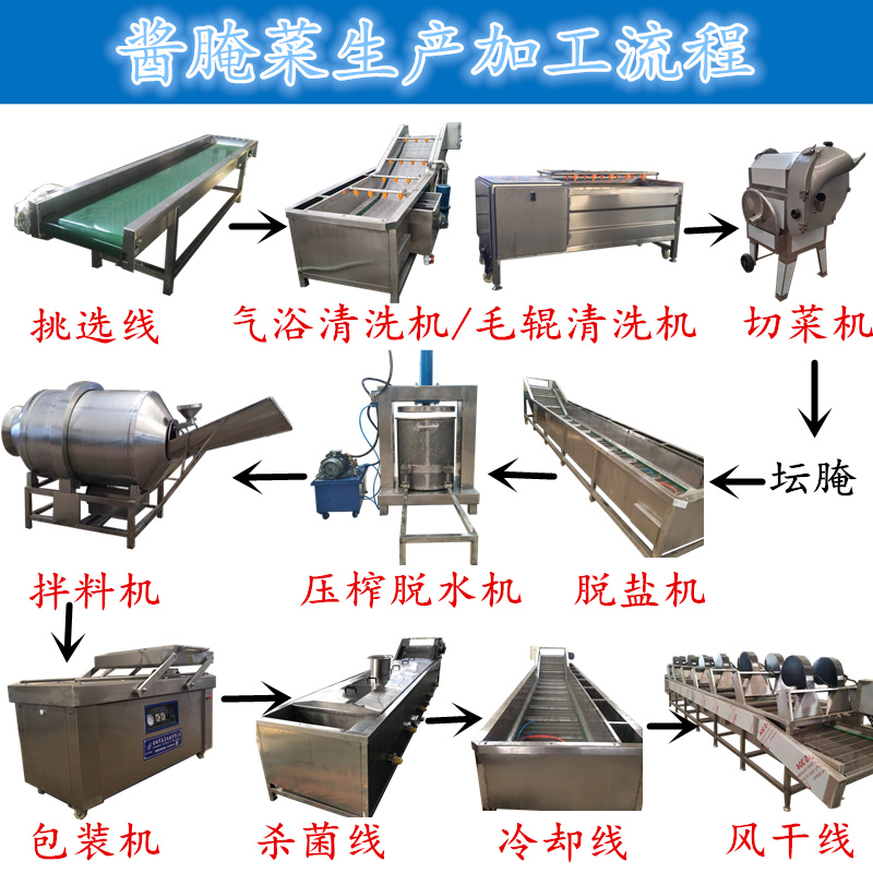 根據(jù)客戶的流水線作業(yè),先用毛輥清洗機(jī)將芥菜榨菜等用軟毛清洗沖刷,地道表面泥土以及污垢。蔬菜從毛輥清洗機(jī)出來后直接進(jìn)入到氣泡清洗,經(jīng)過氣泡清洗機(jī)的二次清洗后,提升機(jī)跟案臺(tái)高度相符,人工挑揀后,切絲機(jī)蔬菜切絲后,提升機(jī)直接送入滾筒拌料機(jī),讓芥菜榨菜充分入味后,發(fā)酵池發(fā)酵后,用液壓壓榨機(jī)壓榨脫水,后經(jīng)滾筒拌料機(jī)加入調(diào)料攪拌,醬菜加工完成。