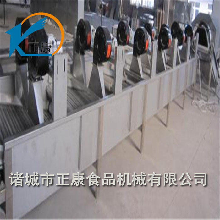 在食品、飲料、制藥等行業(yè)中,一些成品在包裝 完畢后需要進(jìn)行水浴殺菌,經(jīng)殺菌的成品包裝表面附著大量水滴,在裝箱前需要除干包裝表面的水份,被除水包裝產(chǎn)品(袋裝、盒裝、瓶裝)連續(xù)放在可調(diào)速度快慢的不銹鋼網(wǎng)帶上,按序進(jìn)入氣流區(qū),食品風(fēng)干機(jī)產(chǎn)生的高壓、低溫的氣流從噴嘴上下噴射而出,迫使水滴瞬間氣化,從而達(dá)到包裝產(chǎn)品除水、除油漬、水垢等效果。食品風(fēng)干機(jī)系列設(shè)備連續(xù)運(yùn)轉(zhuǎn),被除水包裝成品源源不斷進(jìn)入下一裝箱生產(chǎn)線。