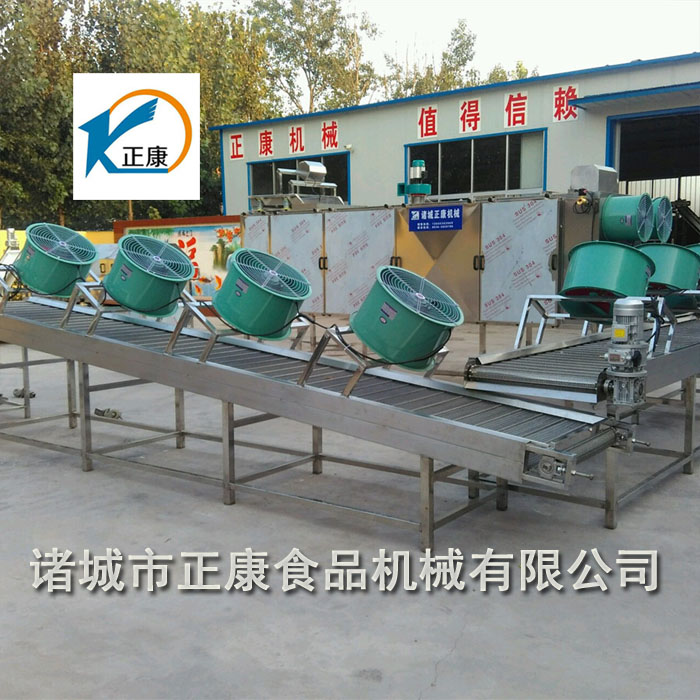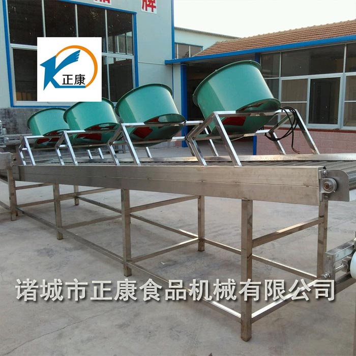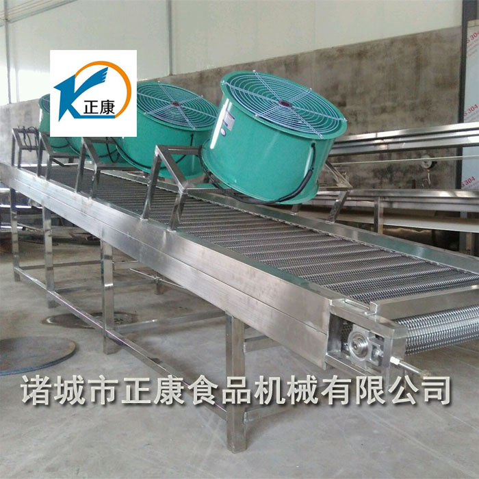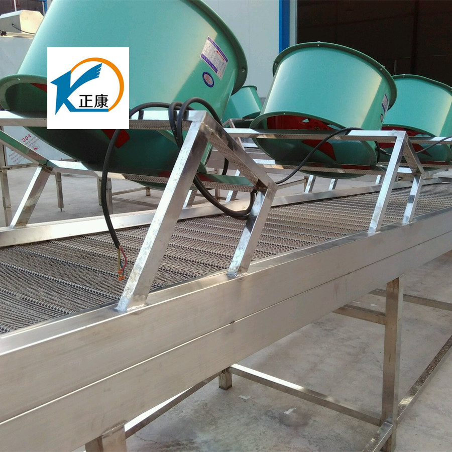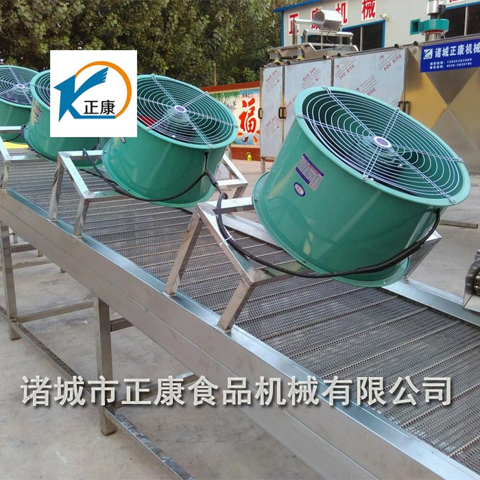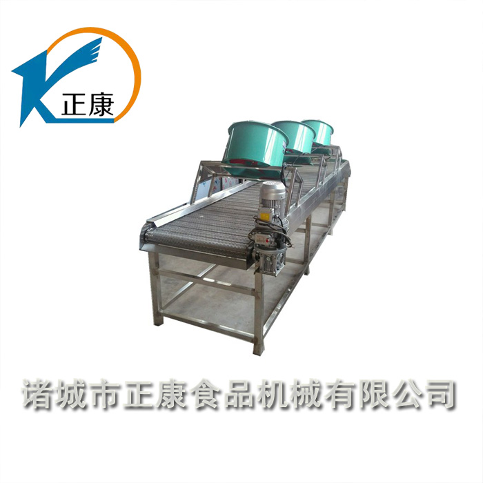 將產(chǎn)品置于輸送帶上,運(yùn)行過(guò)程中通過(guò)上方的風(fēng)機(jī)將產(chǎn)品吹涼。